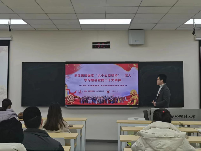 为扎实推进学习贯彻习近平新时代中国特色社会主义思想主题教育,深刻领悟党的二十大精神,加强学生党员理想信念教育,11月15日,西甲直播 、法律硕士教育学院第二十九学生党支部副书记马志龙同志以“学深悟透做实‘六个必须坚持’,深入学习领会党的二十大精神”为主题,在雁塔校区三号教学楼3606教室为支部党员讲授专题党课,党支部全体党员参加活动。