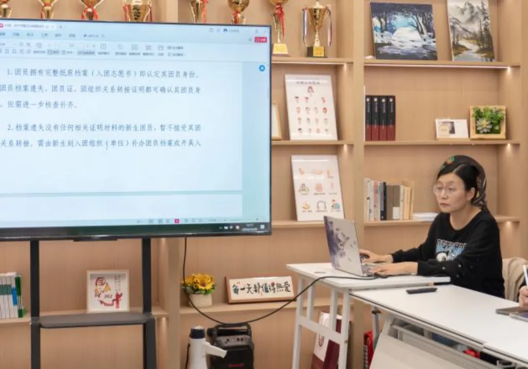 刘钰重点对2024级团支书进行了团务工作的专题培训。首先向与会人员讲解了共青团团旗、团徽、团歌制作使用管理规定。其次对智慧团建系统的管理与操作进行了详尽讲解,强调了主题团日活动的开展方式、具体要求、注意事项等,要求各支部按期开展专题活动,及时录入系统。最后对发展团员的标准进行了规范化说明,并且布置了接下来的核查新生团员档案工作,强调了对新生团员的规范核查标准。