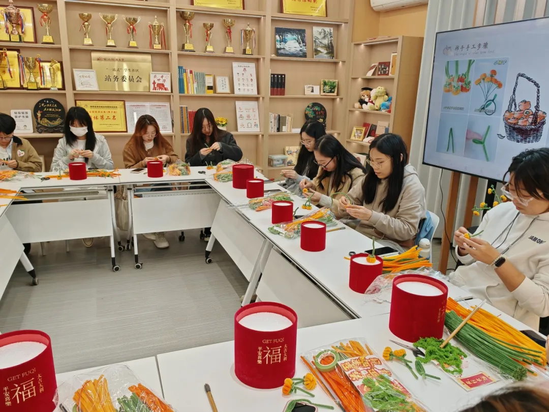 晓明老师讲述了我国古代霜降时节的习俗—吃柿子。在一些地区,霜降时节要吃红柿子,在当地人看来,这样不但可以御寒保暖,而且是非常不错的霜降食品。在霜降吃柿子,寓意事事如意,而制作柿子手工花束,柿子造型的挂件、摆件等,可以为同学们寻找一种轻松、有趣且富有创意的方式来放松身心、释放压力。