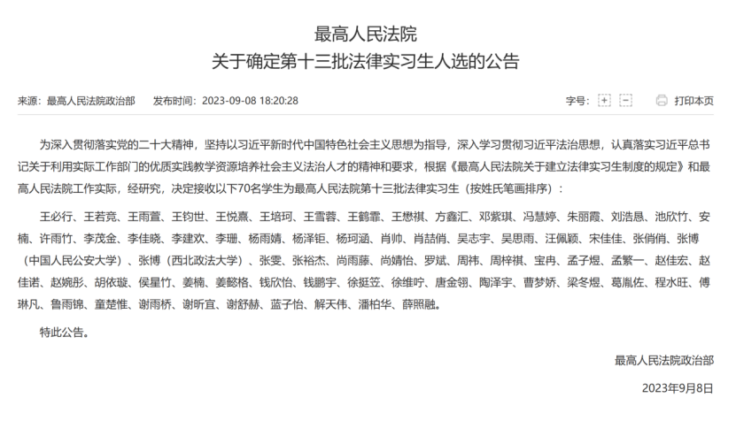 近日,最高人民法院公布了第十三批法律实习生人选名单,我院有3名研究生成功入选,分别是法学理论专业2021级硕士研究生王雪蓉、法律(法学)专业2022级硕士研究生赵佳宏、法律(法学)专业2022级硕士研究生蓝子怡。