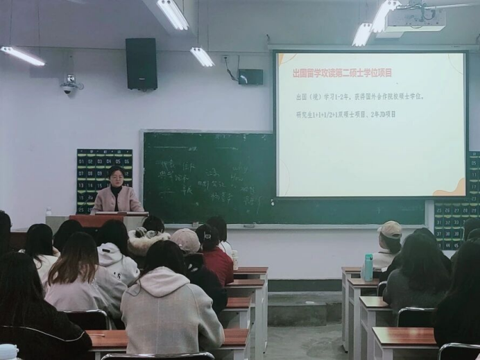 解读会围绕项目类别、学位项目、相关政策及时间安排展开。张老师详细介绍国家公派项目、长短期出国(境)学习交流项目、出国留学攻读硕士学位项目的推荐院校、人数、语言条件及学费;重点讲解学校留学政策、申请流程与关键时间点,还分享往届学生选择的国(境)外院校及就业情况。互动环节,张老师解答学生疑问,并建议有留学意向的新生尽早准备材料。