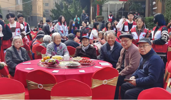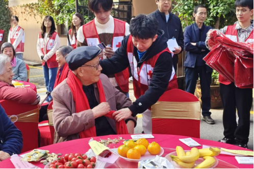 活动过程中,志愿者们将寓意吉祥平安的红围巾一一为老人们佩戴整齐,火红的颜色映衬着张张笑脸,更添节日喜庆。在温馨的祝福歌声中,志愿者们为老同志们端上重阳节蛋糕,细心为每位老人分切、递送,并致以诚挚的节日问候。演出期间,志愿者们始终守候在侧,及时为老人递上暖茶,端来一碗碗热气腾腾的重阳长寿面。对于行动不便的老同志,他们更是细心搀扶,耐心陪同如厕、寻座,全程呵护备至。演出结束后,志愿者们又迅速投入到整理工作中,清理桌面、归置物品、打扫场地,忙碌的身影成为会场另一道温暖风景。细致入微的服务赢得了老同志们的高度赞扬。