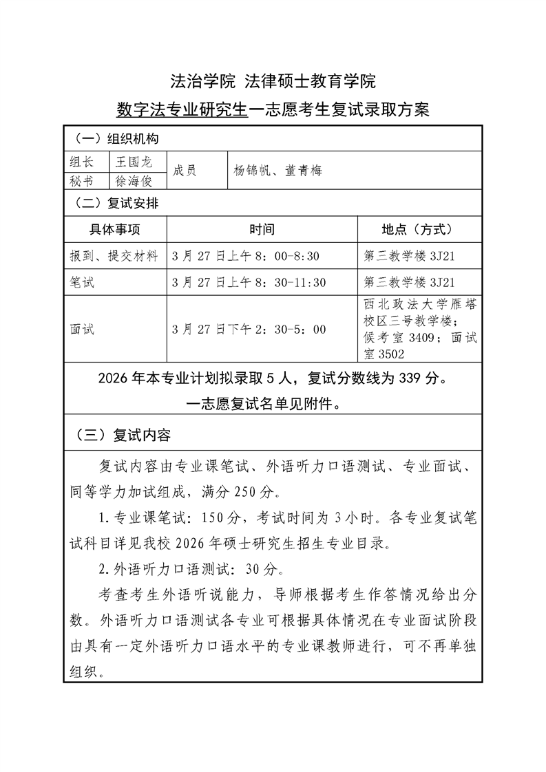 西北政法大学2021年法律硕士研究生招生复试量化成绩及拟录取公告2022-03-22