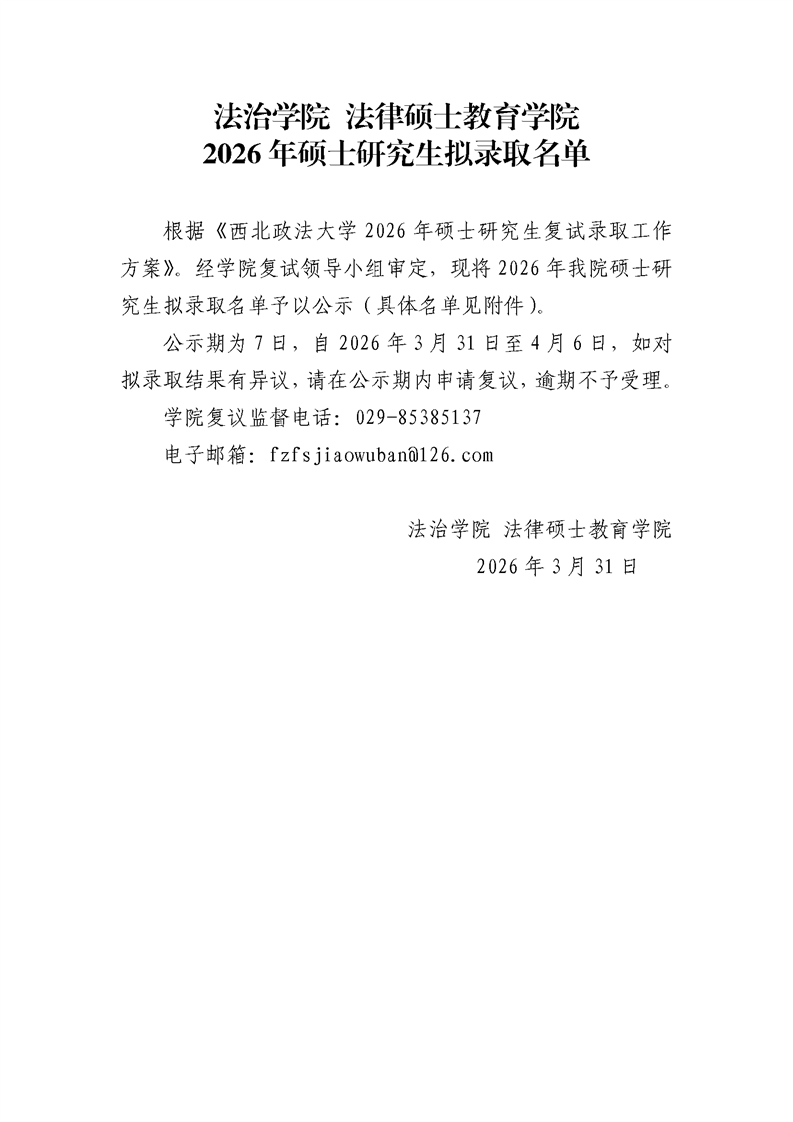 西北政法大学2021年法律硕士研究生招生复试量化成绩及拟录取公告