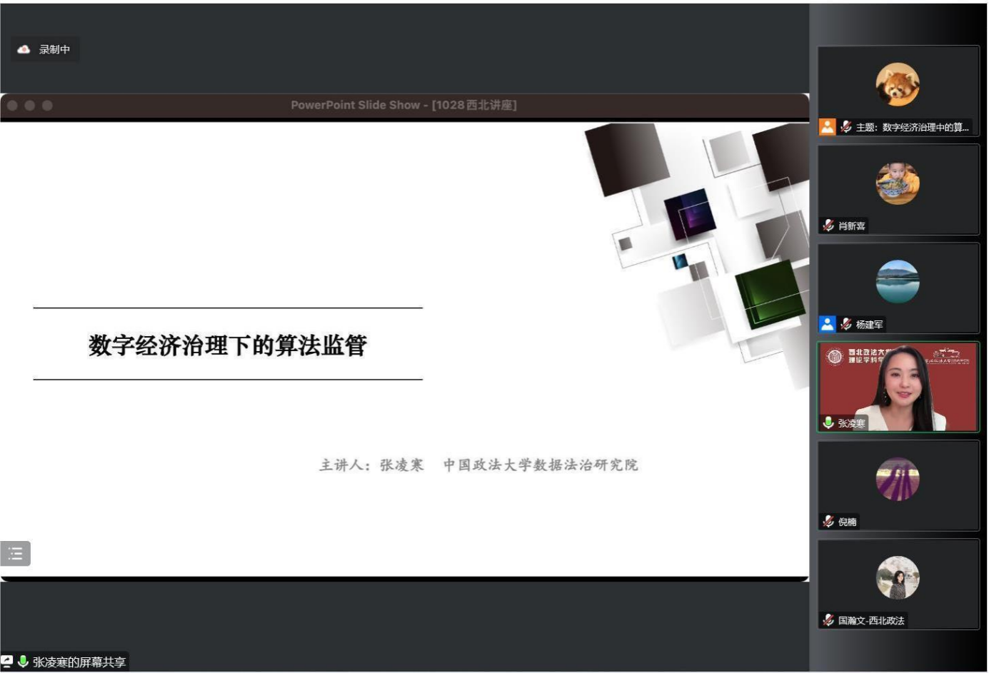 10月28日晚19:30,由西北政法大学科研处、发展规划与学科建设处,西甲免费直播 主办,法学理论学科、法治文明与社会治理校级研究基地协办的西北政法大学建校85周年系列学术讲座暨法学理论学科学术讲座第4期在线上举行。中国政法大学法学院博士生导师张凌寒教授做题为《数字经济治中的算法监管》讲座。讲座由西北政法大学西甲直播 杨建军教授主持,倪楠教授、肖新喜教授、杨锦帆副教授、国瀚文博士与谈。校内外300余人参加讲座。