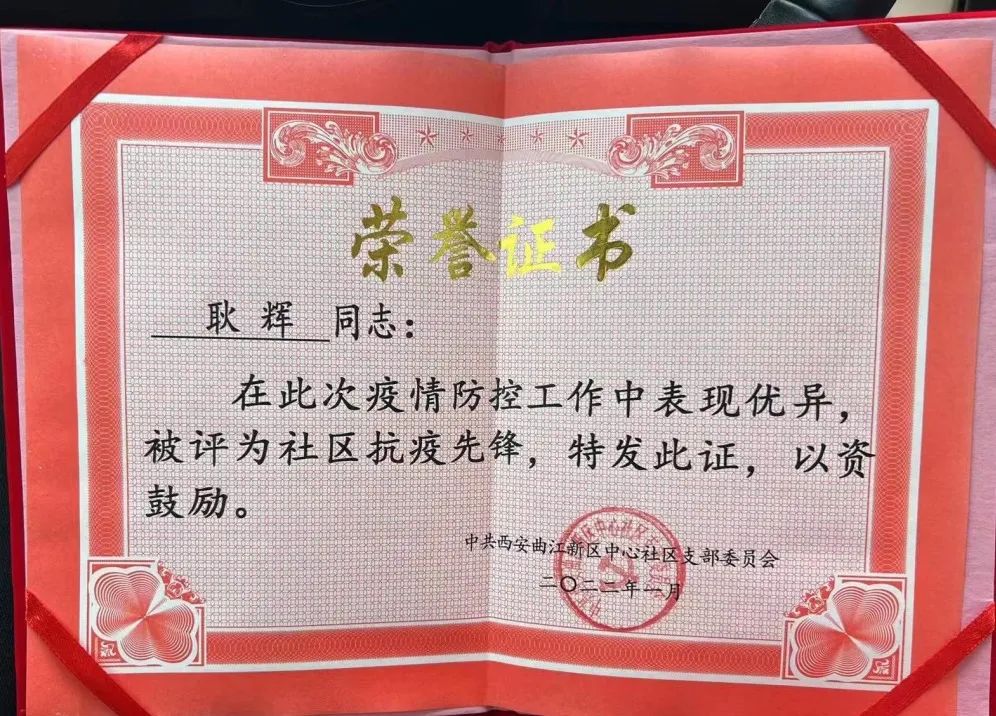 在今年年初西安的德尔塔疫情防控中,耿辉更是身体力行,作为志愿者参与了核酸检测、物资派送等社区疫情防控工作。由于在抗疫工作中的突出表现,他也被西安市曲江中心社区党总支评为了“社区抗疫先锋”。法律工作者天然承担着社会服务职责,耿辉对此有着强烈的使命感和责任感。“选择了法律工作,就注定要做社会秩序良好运行的捍卫者,除了律师工作本身,投身公益,也是让我们法律工作者更好服务社会的另一种途径”。