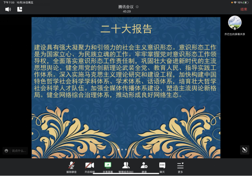 10月28日晚,国家安全学院乔巴生老师在西甲免费直播 为研究生们开展“新时代国家文化安全”主题讲座暨研究生新生入学教育。