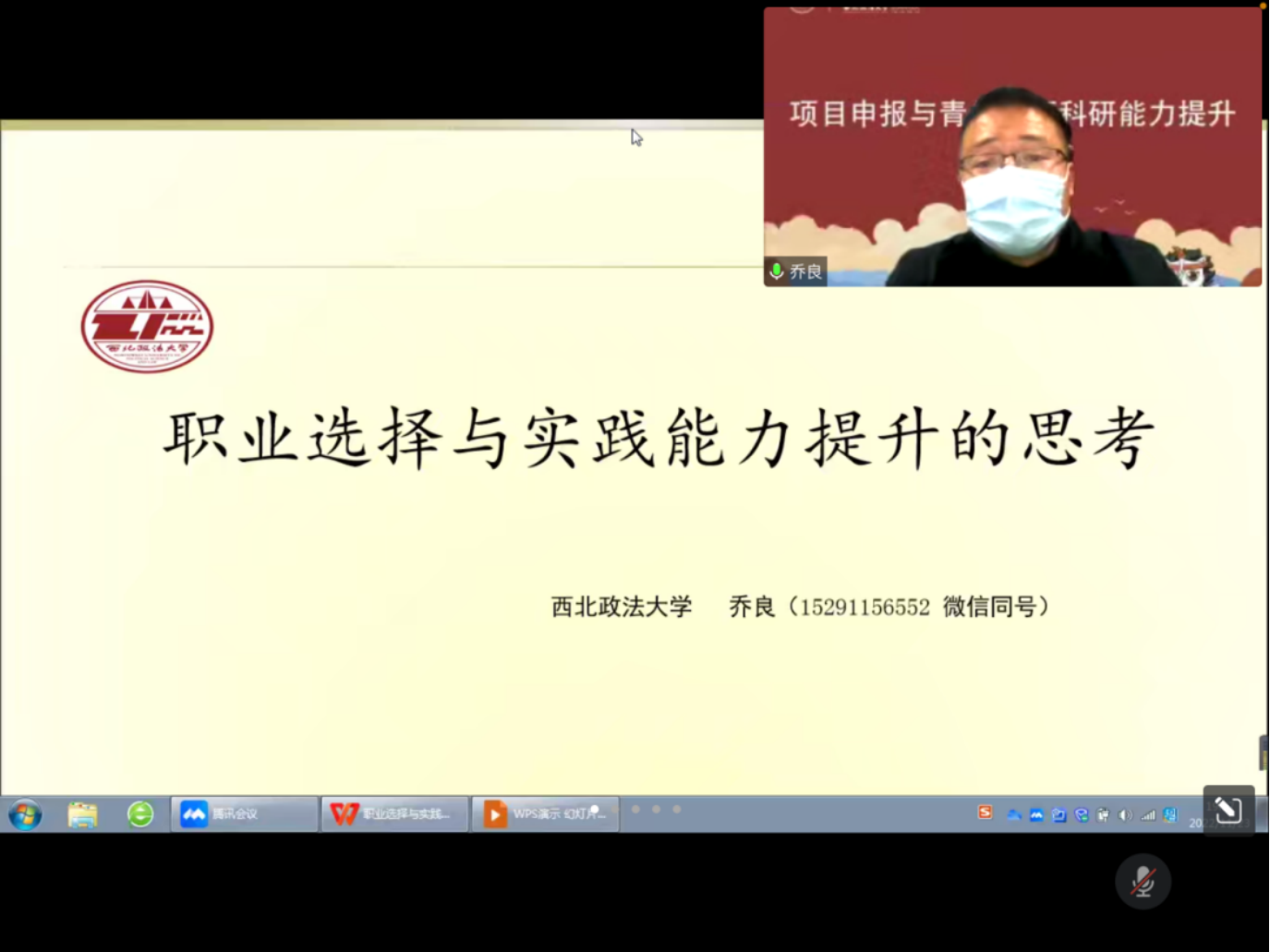 11月23日19:00,由西北政法大学科研处、发展规划与学科建设处主办,西甲免费直播 承办,习近平法治思想研究中心协办的西北政法大学建校85周年系列学术讲座暨西北政法大学法治讲堂系列讲座第十六期通过线上与线下相结合的方式举行。西北政法大学行政法学院乔良博士做题为《研究生职业选择与实践能力提升的思考》讲座。讲座由西甲免费直播 副院长淡新昌主持,线上与线下100余人参加。