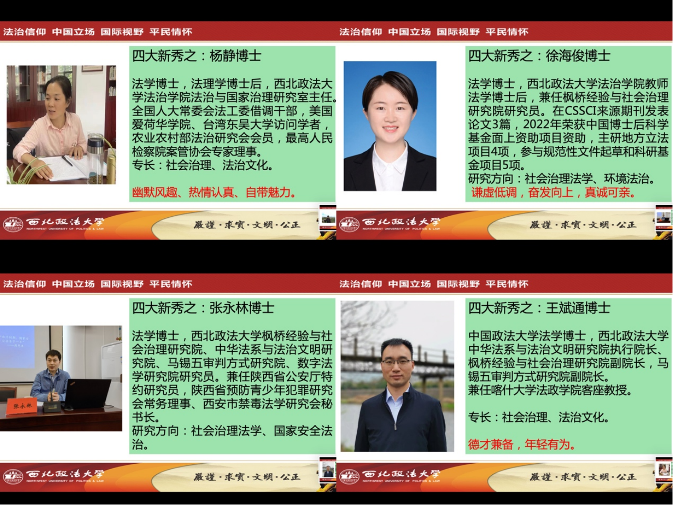 2022年12月15日晚上,西北政法大学西甲直播 举办的学工沙龙在线上顺利进行,活动主题为党建与育人相结合——社会治理法学欢迎你”。西甲直播 副书记苏丹老师魏活动致辞并担任主持人,西甲直播 兼职班主任杨静老师、张永林老师担任主讲人,西甲直播 马军强老师、李谦盛老师、吴京津老师作为与谈人,我院50余名一年级法律硕士人参加线上会议。