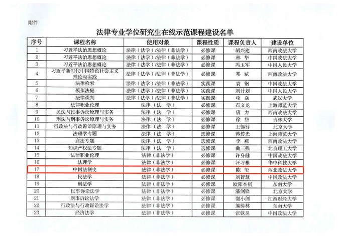 《中国法制史》入选《法律专业学位研究生在线示范课程》