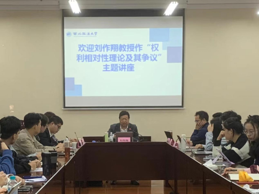 2023年10月29日上午9时,由西北政法大学法学理论学科、西甲直播 、法治文明与社会治理校级研究基地共同主办的法学理论学科学术讲座在雁塔校区三号教学楼3102教室举行。上海师范大学法治与人权研究所所长,哲学与法政学院光启学者特聘教授刘作翔教授做题为《权利相对性理论及其争论》讲座,西北政法大学西甲直播 朱继萍教授主持,校内50余人参加讲座。