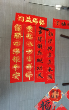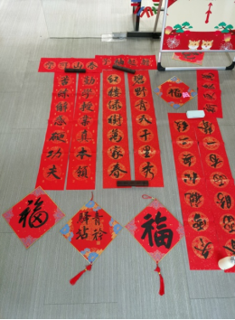 同学们经过简单练习后,在宣纸、对联纸及红卡纸上创作了属于自己的作品。