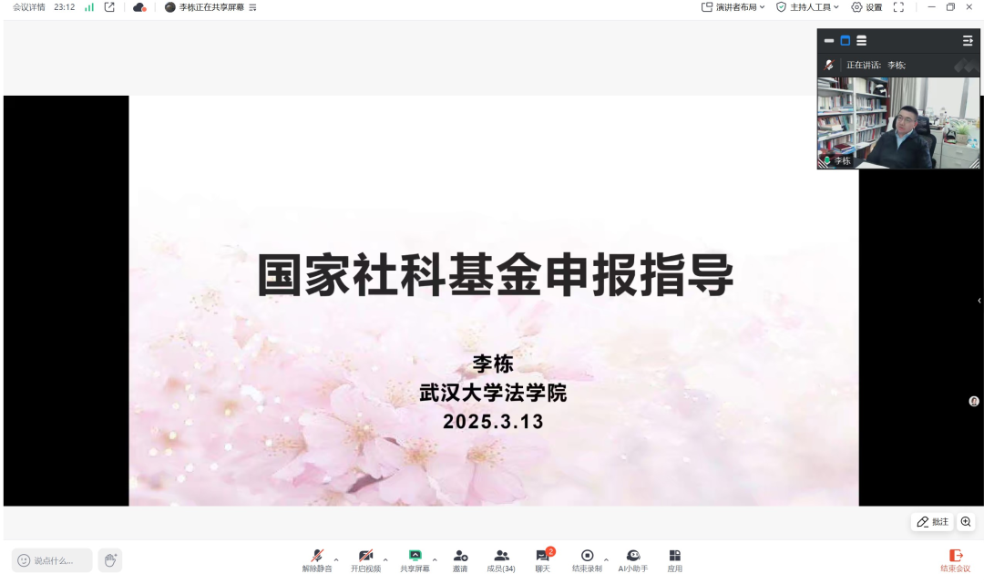 3月13日下午,武汉大学法学院博士生导师李栋教授作“国家社科基金项目申报指导”专题讲座,西甲免费直播 院长陈玺主持会议,科研处副处长尚海洋、青年教师代表、博士生等近50余人参加讲座。