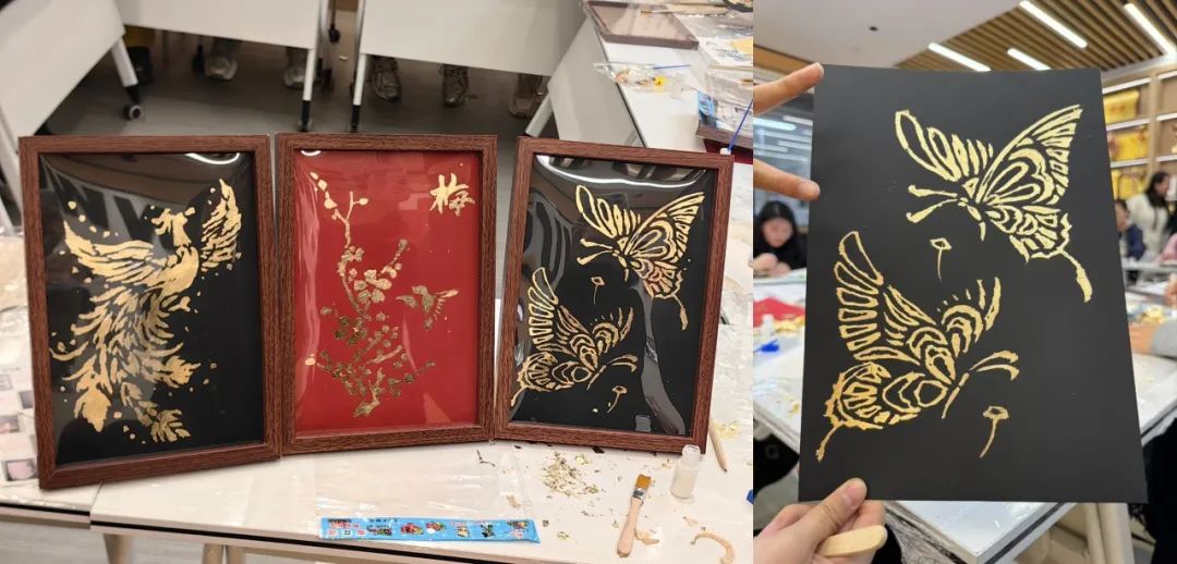同学们在专业老师的指导下,以金属箔为墨,通过“烧箔、绘制、涂胶、贴箔”四道工序,将春分元素融入创作。用金箔勾勒繁花绽放的图案,箔片在熨烫下呈现孔雀蓝、铜绿等瑰丽色泽,金属肌理与节气意象交织,诠释中式美学的质朴优雅。