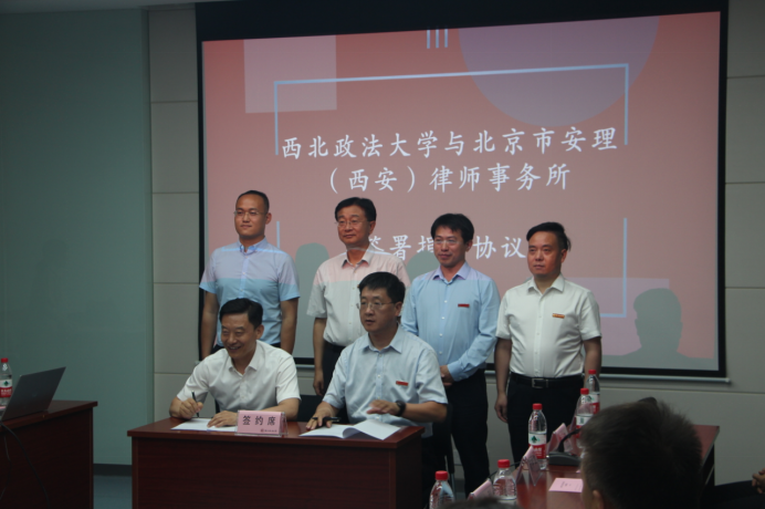 在屈金冈先生发言过后,在西北政法大学校长范九利、西甲免费直播 党委书记张学龙、院长陈玺的见证下,西北政法大学国内合作与校友工作处处长刘霖杰与屈金刚先生签署了捐赠协议。